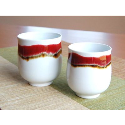 This pair of Arita ware teacups from the “Silk Road” series features graceful layers of deep crimson “Shinsa” (cinnabar) glaze flowing across the pure white porcelain. Each piece displays its own unique pattern, created naturally during the firing process, showcasing the refined glazing mastery of Shinemon Kiln. The elegant crimson hue stands out beautifully, blending Japanese sophistication with a subtle exotic charm. Presented as a pair in a wooden box, they make a luxurious gift or a perfect set for sharing peaceful tea moments together.