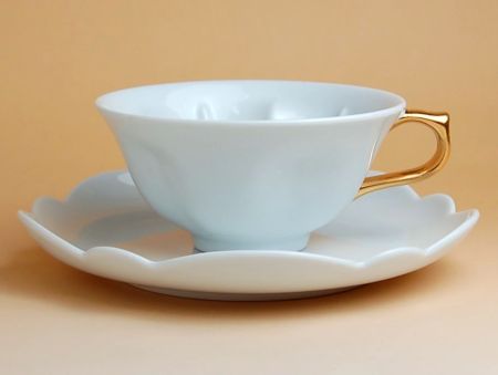This Arita porcelain tea cup and saucer set features a refined cherry blossom shape in pure white porcelain with a graceful gold handle. When tea is poured, a delicate sakura flower appears on the surface, creating a serene and elegant moment. Its simple yet sophisticated design makes it perfect for both everyday use and special occasions.