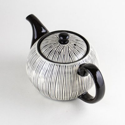 細かく彫られた縦縞模様が目を引く、モダンな印象のポットです。手作業で丁寧に彫られた線が、素朴さと職人の技を感じさせる一品。黒と白のコントラストが美しく、和洋問わず食卓に映えます。420mlの程よい容量で、1〜2人用のティータイムに最適。ステンレス製の茶漉し付きで、使い勝手も抜群です。有田・波佐見地区で作られた、実用性とデザイン性を兼ね備えた陶器のポットです。
