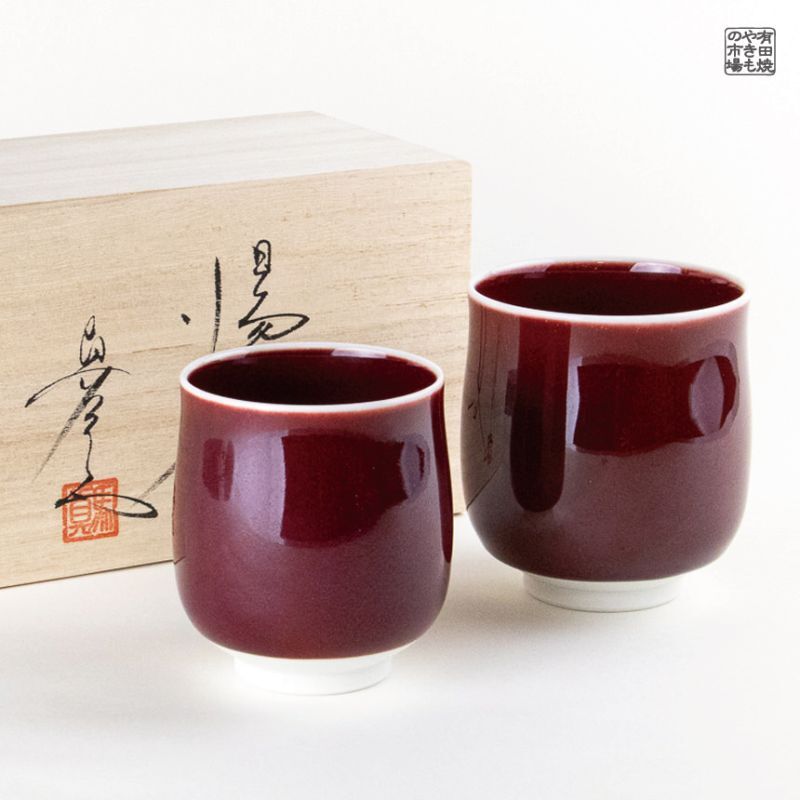 This pair of Arita ware teacups, known as “Naigai Shinsa,” features a deep crimson “Shinsa” (cinnabar) glaze applied both inside and outside. The glaze’s subtle variations in tone arise from the delicate balance of flame and oxygen during firing, making each piece uniquely expressive. The lustrous red stands out beautifully against the white porcelain, blending elegance with warmth. A superb creation by the renowned Shinemon Kiln, this set is perfect as a refined gift for couples or parents, presented in a luxurious wooden box.