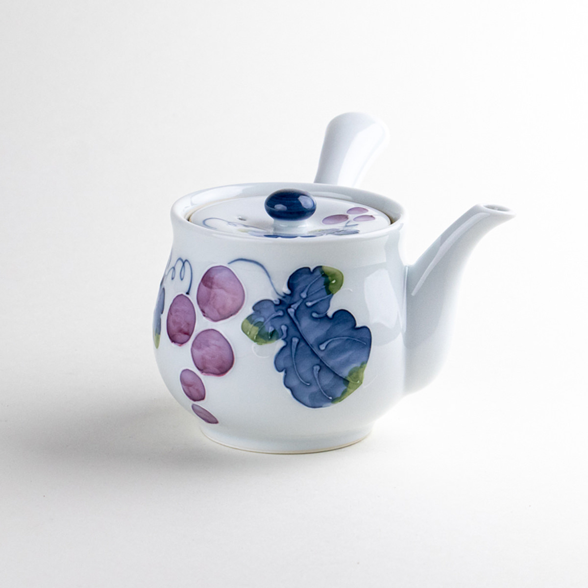 爽やかな色彩で描かれたぶどうのデザインが印象的な小ぶりの急須です。1〜2人分のお茶にちょうど良いサイズで、手にすっとなじむ持ちやすさも魅力。内側にはステンレス製の茶こしが付属し、実用性にも優れています。毎日のティータイムを華やかに彩るアイテムです。