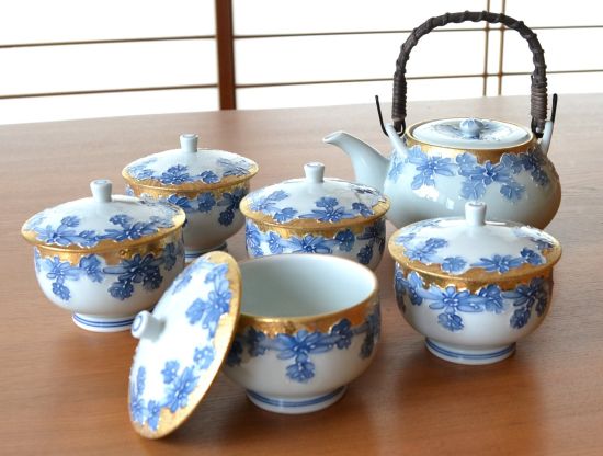 立体的に描かれた青い菊の花が金彩をまとい、器の縁を上品に彩ります。土瓶1個と蓋付き湯呑5個がセットになっており、来客用や贈り物にも最適です。湯呑は保温性に優れ、土瓶にはステンレス製の茶漉しが付属しており、実用性も備えています。有田焼ならではの精緻な造形と華やかさを楽しめる一品です。