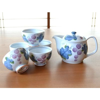 This refreshing tea set features a delightful muscat grape design, hand-painted in translucent shades of purple and green. It brings a cheerful charm to your tea time. The set includes one teapot and five teacups, making it perfect for everyday use, entertaining guests, or gifting. A stainless-steel tea strainer is included in the teapot for convenience. Proudly made in Japan's Arita and Hasami regions, known for their exceptional porcelain craftsmanship.