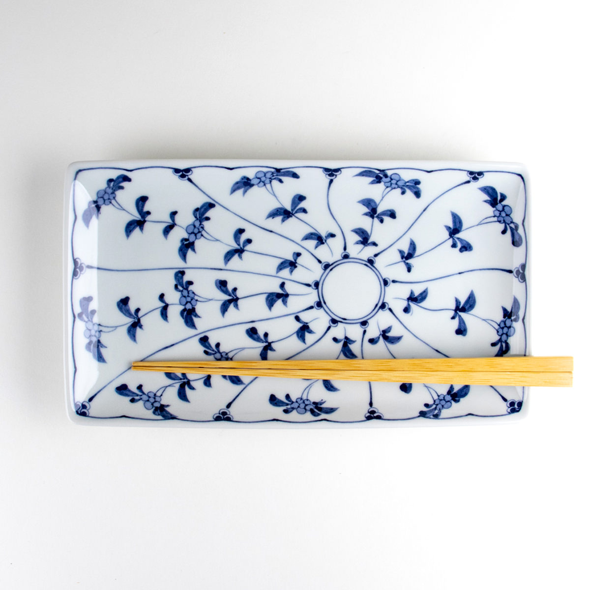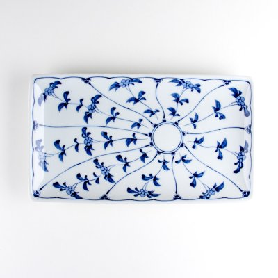 섬세한 풀꽃 무늬가 방사형으로 퍼지는 직사각 접시입니다. 중앙에서 퍼지는 선들이 우아한 리듬감을 자아내며, 생선구이 또는 스시를 고급스럽게 연출해줍니다.