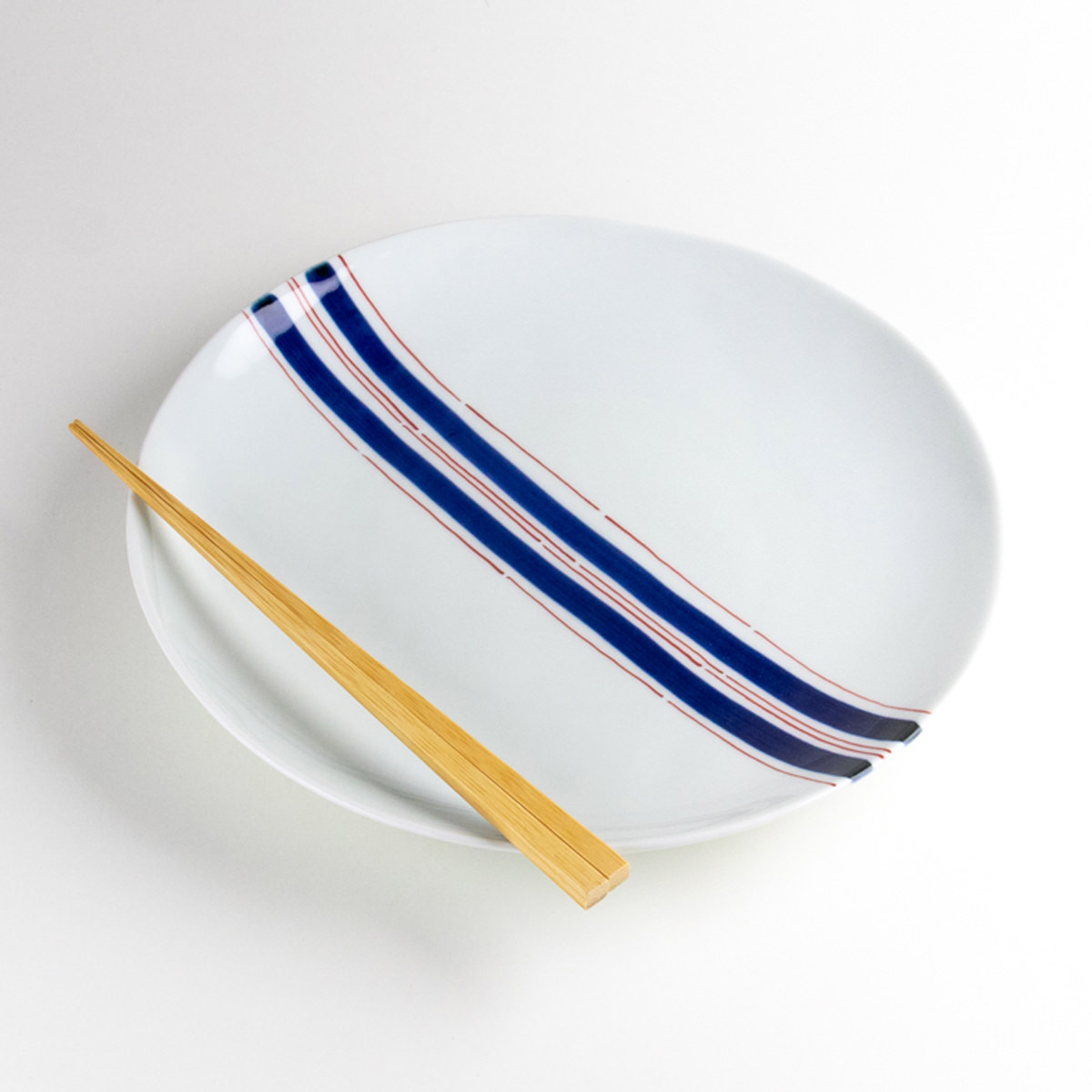 A modern and refined 24.5 cm plate featuring two bold navy-blue bands accented by delicate red lines. The clean design complements both Japanese and Western cuisine, making it ideal for main dishes or one-plate meals. Perfect for both everyday dining and entertaining guests.