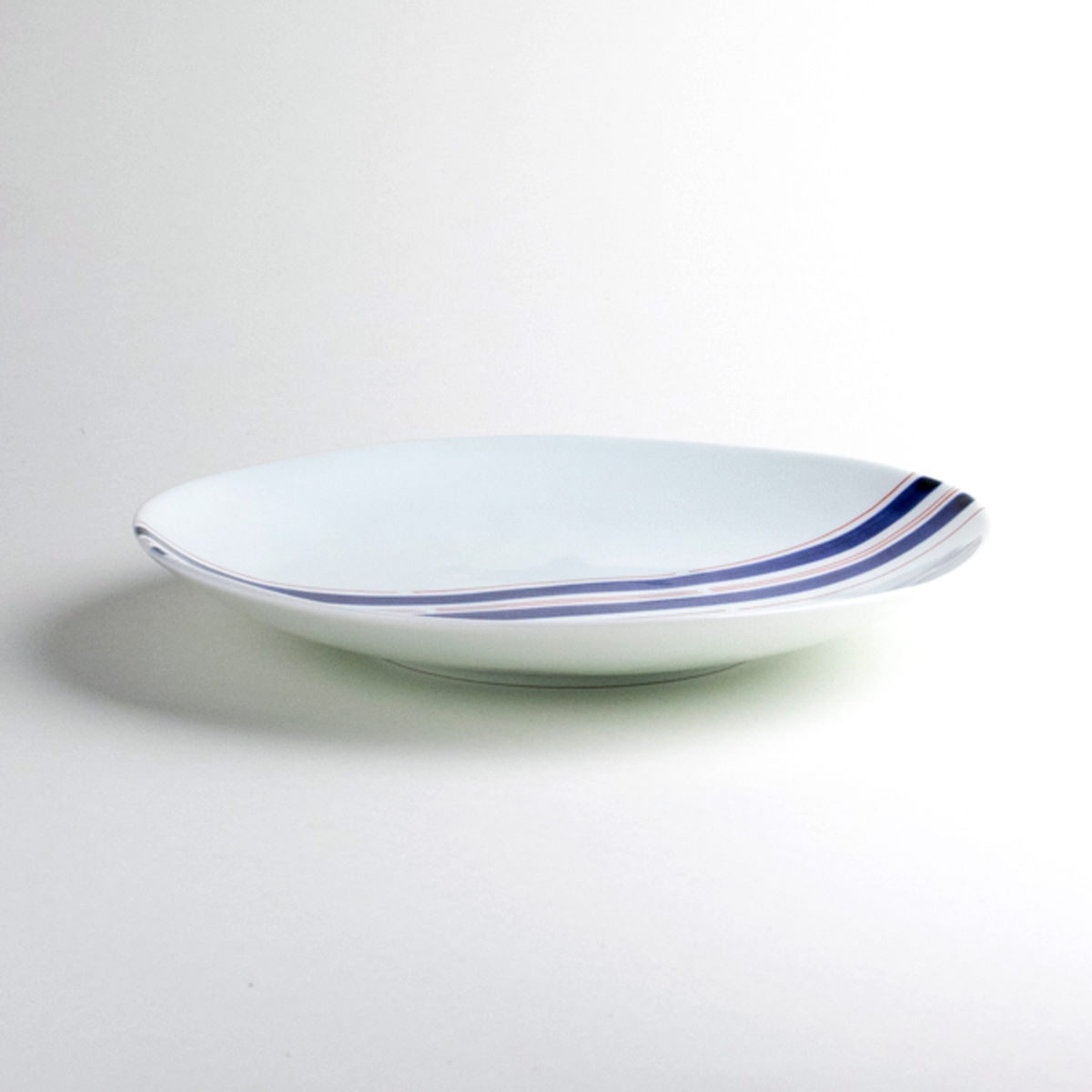 This plate features graceful blue bands accented with fine red lines, offering a refined yet simple design. Its clean, modern pattern suits both Japanese and Western dishes. Perfectly sized for salads, side dishes, or desserts, it's ideal for everyday use.