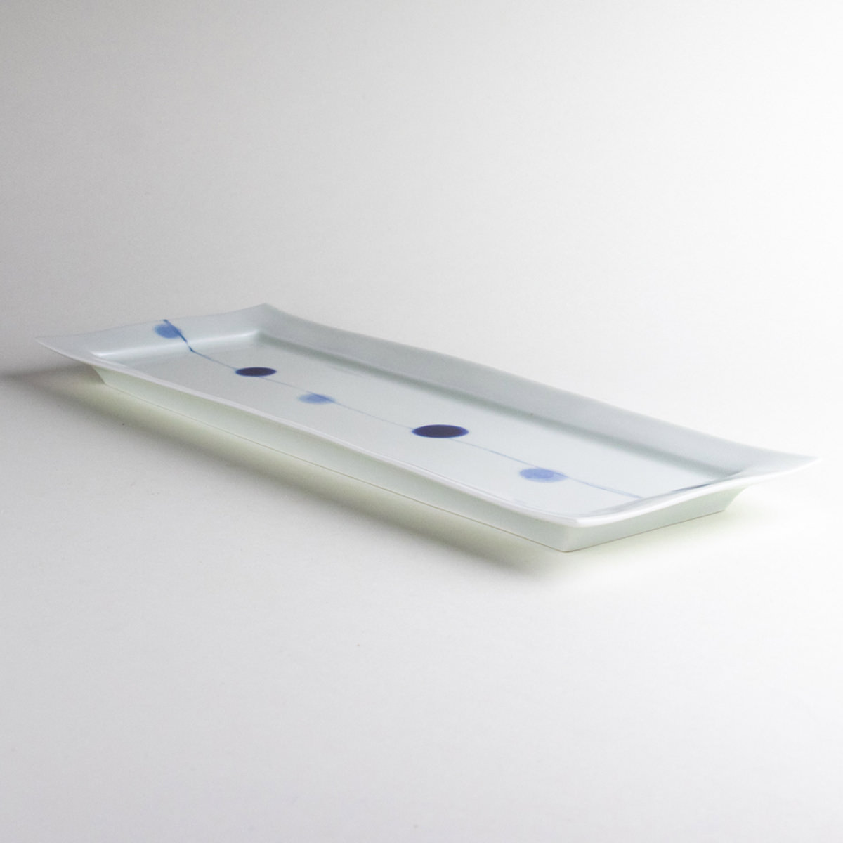 光沢のある白磁に、にじんだような紺と淡い青の水玉が一列に並ぶ、シンプルながらも印象的なデザインの帯皿です。30cmの長さがあり、サンマのような長い魚の盛り付けにぴったり。また、前菜の盛り合わせや、パーティーのオードブルを美しく並べる器としても活躍します。