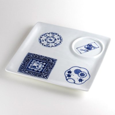 A unique square plate featuring stylized motifs inspired by traditional Ko-Imari ware. The designs depict actual small dishes and bowls that are sold separately, adding a playful and artistic touch. Ideal for serving main and side dishes together, this one-plate style is perfect for everyday meals, blending tradition with modern usability.