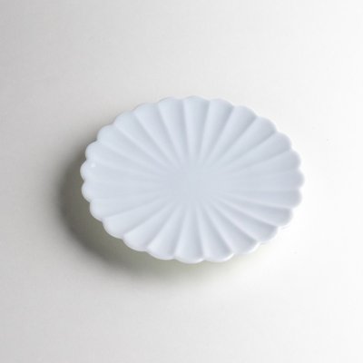 菊の花をモチーフにした繊細な造形が美しい、白磁の4寸皿です。上品な光沢をもつ白磁が、菓子や副菜などの盛り付けを引き立てます。ティータイムの菓子皿としてはもちろん、お漬物やちょっとした前菜にもおすすめです。重ねやすく、日常使いにも適した一枚です。