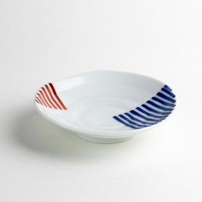 赤と青のラインがアクセントになった、スタイリッシュなデザインの小皿。シンプルながらも印象的な配色で、食卓にモダンな雰囲気を添えてくれます。醤油皿や薬味皿、ちょっとしたおつまみを盛り付けるのに最適。シリーズで揃えて、カジュアルな来客用にもおすすめです。