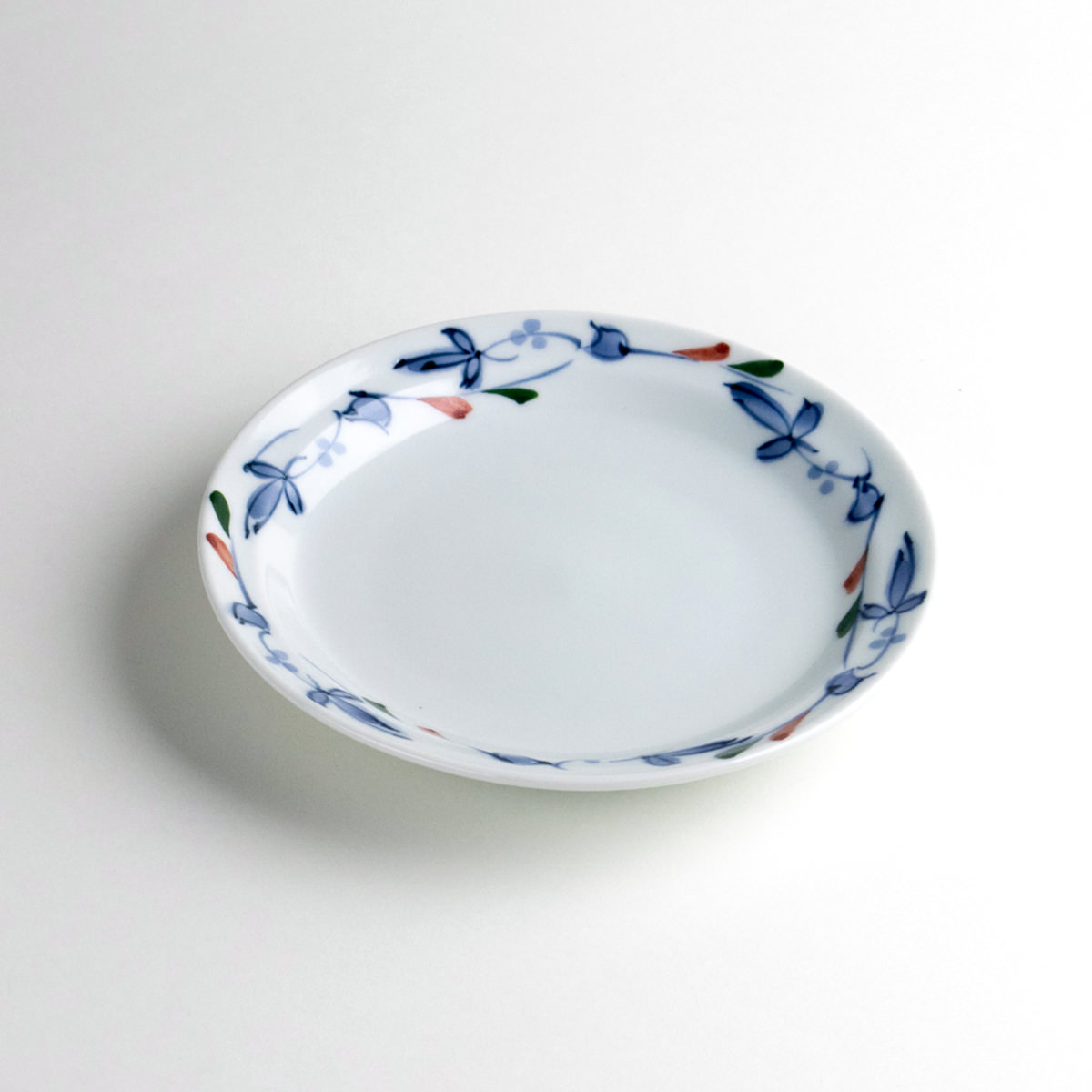 가느다란 덩굴무늬가 테두리를 장식한 아담한 접시로, 파랑·빨강·초록의 섬세한 채색이 식탁에 은은한 색감을 더해줍니다. 지름 13.5cm로 반찬, 디저트, 다과를 담기에 알맞습니다. 일상 사용은 물론 손님 접대에도 잘 어울립니다.