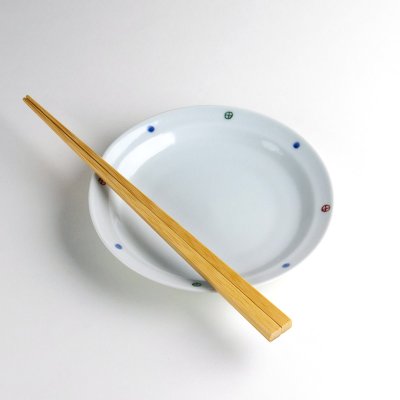 白磁の余白を活かし、縁に三色の点紋がリズミカルにあしらわれた小皿です。赤・青・緑の色彩がほどよいアクセントとなり、シンプルながらも遊び心のある一枚。取り皿としてはもちろん、副菜やお菓子の盛り付けにも活躍します。